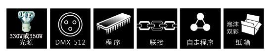 电 压: AC110V~240V/50~60Hz功 率: 470W 灯 泡: OSRAM SIRIUS HRI 350w 灯泡寿命: 2000小时色 温: 8000K图 案 盘:1个固定图案盘,14个固定图案+白光,每个图案都有抖动效果,图案盘带正反向快慢流水效果,含5个玻璃图案颜 色 盘:1个颜色盘,13色+白光,每个颜色片均可与相邻的颜色片做半色效果、均可双向快慢流动彩 虹 盘:1个七彩颜色盘,可营制出炫丽的彩虹效果双 棱 镜: 内置双棱镜,8棱镜+直线6棱镜;独特的双棱镜设计,均可相互组合叠加或单独快慢旋转变化,生成奇异特殊多光束效果雾 化 镜:1个雾化效果,0%~100%均匀柔光雾化效果光 束: 多级光束角度变化效果光束角度: 2.5-20°调 光: 0-100%线性调光,支持机械频闪和可调速频闪效果,支持频闪宏功能频 闪: 双侧刀高速频闪,并可先择随机频闪及脉冲频闪,频闪频率高达1~14次/秒,频闪频率速度可任意调节调 焦: 电动对焦,超微顺滑调整焦距扫 描: X轴540°,Y轴270°,解析度16Bit驱动,可自动校正定位,电子纠错电子纠错:采用光电复位系统,当偶然发生误动后,可自动检索复位保 护:带过热保护控制方式: 国际标准DMX512、自走、主从、声控 通道数量: 16通道显 示 屏:2.2寸液晶彩屏,可倒转180°显示,内置重力感应,当倒立安装时,自动翻转倒立显示外 观: 耐高温塑料外壳,高强度合金冷压成型内核材料工作环境:IP20/室内使用,工作环境温度:-20°C ~40°C